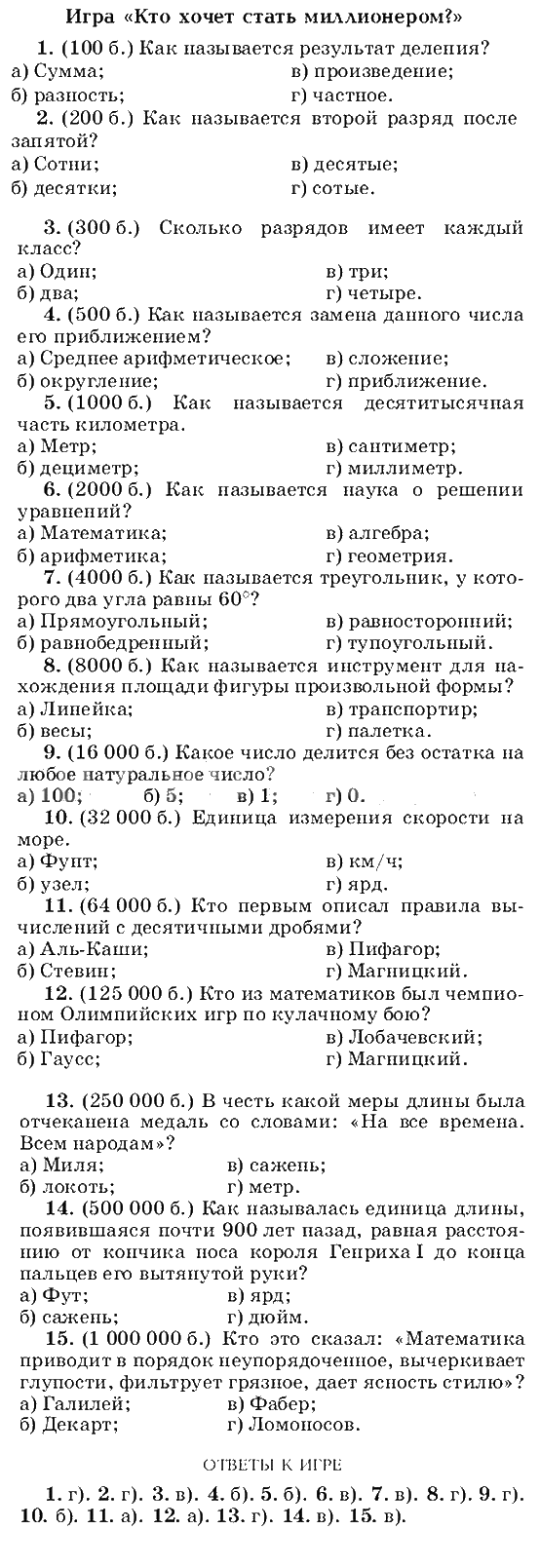 Решения домашних заданий по математике 5 класс Муравин, Муравина Гл. 6 Арифметические действия Игра Кто хочет стать миллионером упражнение