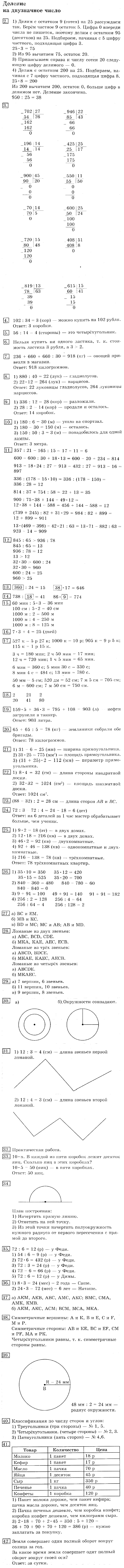 - 1 Числа от 100 до 1 000 2 Сравнение чисел. Знаки больше и меньше 3 Километр. Миллиметр 4 Ломаная 5 Длина ломаной 6 Масса. Килограмм. Грамм 7 Вместимость. Литр 8 Сложение 9 Вычитание 10 Сочетательное свойство сложения 11 Сумма трёх и более слагаемых 12 Сочетательное свойство умножения 13 Произведение трёх и более множителей 14 Симметрия на клетчатой бумаге 15 Порядок выполнения действий в выражениях без скобок 16 Порядок выполнения действий в выражениях со скобками 17 Высказывание 1 Числовые равенства и неравенства 2 Деление окружности на равные части 3 Умножение суммы на число 4 Умножение на 10 и на 100 5 Умножение в случаях вида 50 на 9 и 200 на 4 6 Прямая 7 Умножение на однозначное число 8 Измерение времени 9 Деление на 10 и на 100 10 Нахождение однозначного частного 11 Деление с остатком 12 Деление на однозначное число 13 Умножение в случаях вида 23 на 40 14 Умножение на двузначное число 15 Деление на двузначное число