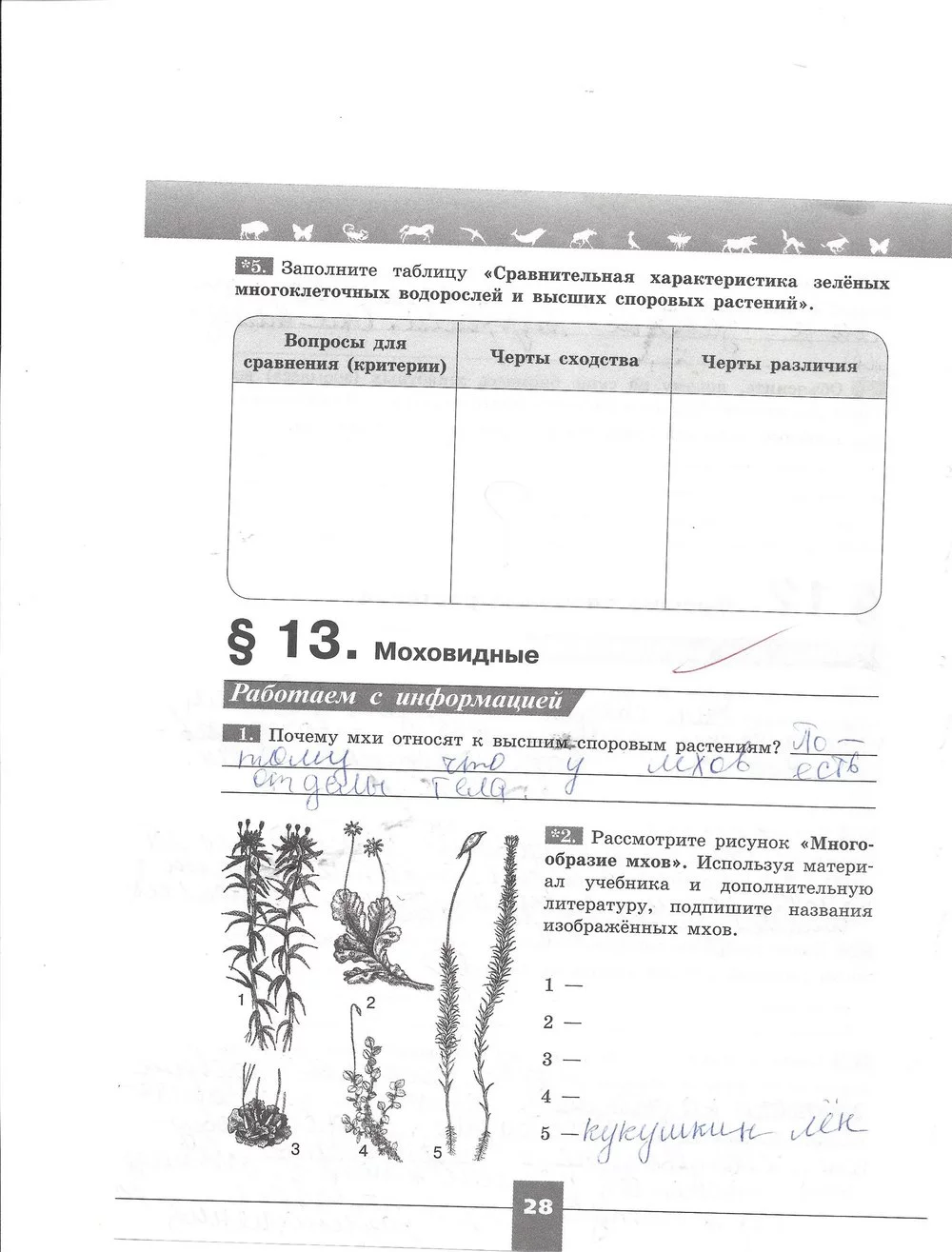 Решения домашних заданий по биологии 7 класс Пасечник В.В, Суматохин С.В., Калинова Г.С., Швецов Г.Г. 28 упражнение Рабочая тетрадь