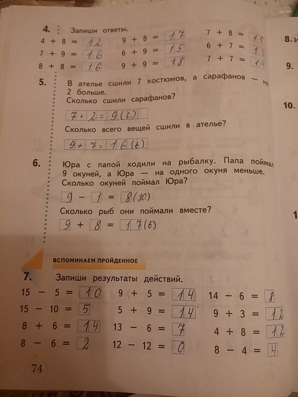 Решения домашних заданий по математике 1 класс Рудницкая В.Н. 74 упражнение Рабочая тетрадь