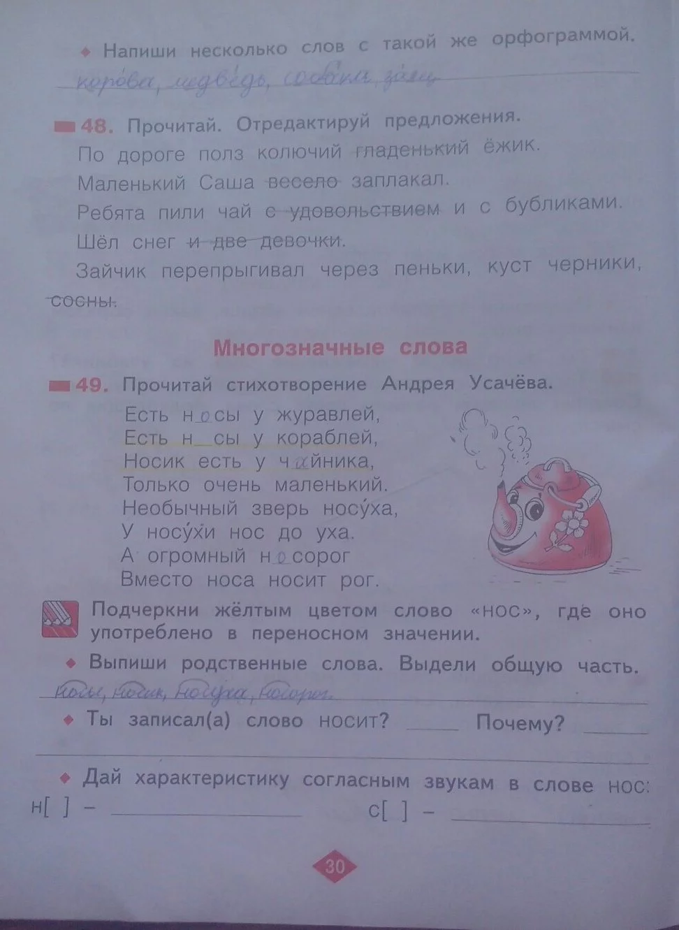 Решения домашних заданий по русскому языку 2 класс Яковлева С.Г. 30 упражнение Рабочая тетрадь