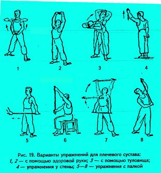 Вначале это упражнение выполняется с посторонней помощью согнутой в локте рукой. В дальнейшем отведение руки увеличивается, но не должно превышать 90° в период иммобилизации. Наряду с этими специальными выполняются и ОРУ.
