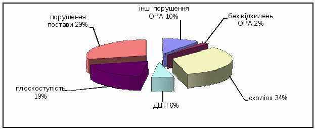 Отже, з поданої діаграми видно, що найпоширенішим захворюванням опорно-рухового апарату серед слабозорих дітей молодшого шкільного віку є сколіоз (34%) та порушення постави (29%). Рідше зустрічається плоскостопість (19%), ДЦП (6%) та інші порушення (10%). Дітей, у яких відсутні порушення опорно-рухового апарату лише 2%.