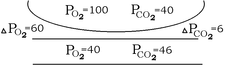 2. Дифузфя газів в легені – перехід О>2> із альвеолярного повітря в кров і СО>2> – в протилежному напрямку за градієнтом парціального тиску цих газів в альвеолярному повітрі та їх напруженням в крові.
