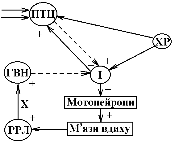 До виконавчих органів належать органи 1-5. За рахунок зміни кількості м’язів, що забезпечують вдих та видих, сили їх скорочення і розслаблення змінюється глибина і частота дихання – зміна вентиляції легень – забезпечення сталого складу альвеолярного повітря. Цей результат дуже важливий, оскільки у здорової людини при проходженні крові через капіляри легень відбувається практично повне вирівнювання складу газів у альвеолах та крові. Тому постійність газового складу альвеолярного повітря є умовою сталості газового складу артеріальної крові – газовий гомеостаз.