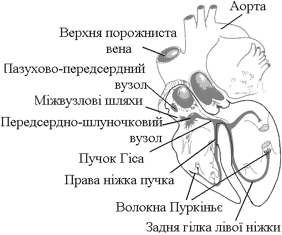 В звичайних умовах послідовність руху збудження по структурах серця така: пазухово-передсердний вузол, робочий міокард, передсердь передсердно-шлуночковий вузол, пучок Гіса, ніжки пучка Гіса, волокна Пуркіньє, робочий міокард шлуночків.