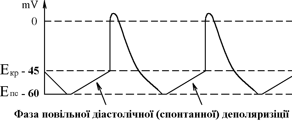 Така зміна стану каналів мембран А-КМЦ веде до повільного зменшення мембранного потенціалу (деполяризація мембрани). Ця деполяризація виникає без дії зовнішнього подразника (автоматично), і коли вона досягає критичного рівня (– 45 mV), виникає пік ПД. Ця частина змін в часі мембранного потенціалу клітини, що володіє автоматією, є специфічною для неї і носить назву фази повільної діастолічної деполяризації, або спонтанної деполяризації.