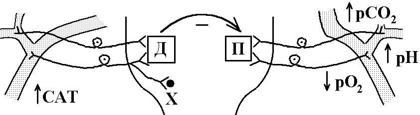 - гуморальні – забезпечують перерозподіл мозкового кровотоку між його областями і таким чином – відповідність кровотоку до метаболічних потреб тканини мозку. Серед метаболітів в регуляції кровотоку ГМ найбільш важливі СО>2>, Н+, К+, аденозин.