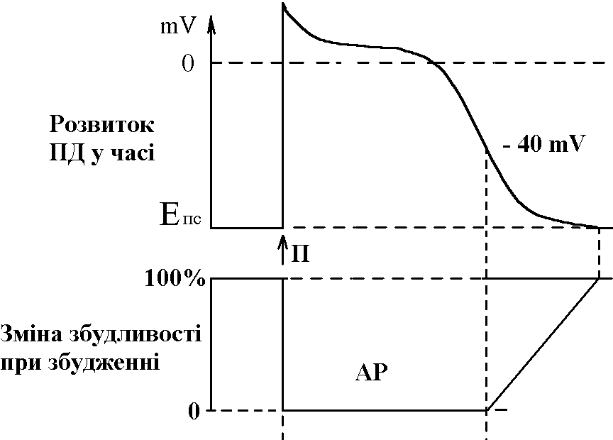 Значення великої тривалості ПД Т-КМЦ стає зрозумілим, якщо співставити його в часі з графіком зміни збудливості Т-КМЦ при збудженні з графіком поодинокого скорочення міокарда: