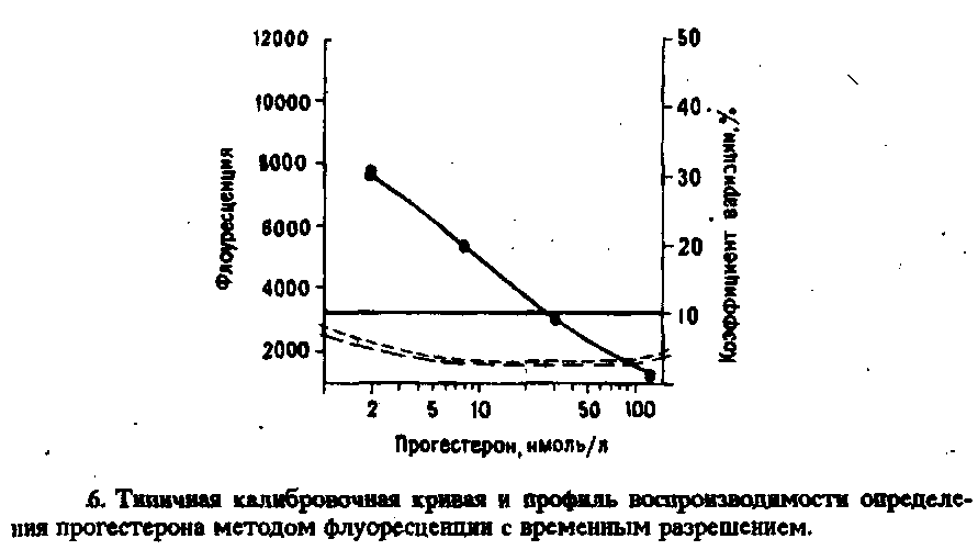 Результаты определения прогестерона, полученные методом DELFIA, хорошо согласуются с данными, полученными с применением выпускаемых промышленностью наборов РИА для прямого определения, например Coat-a-Count и New Amerlex-M.