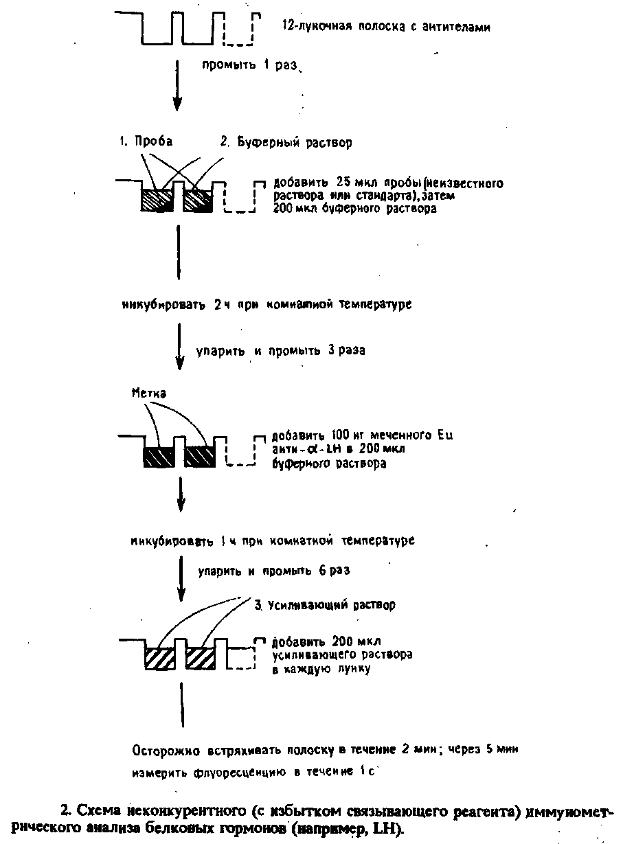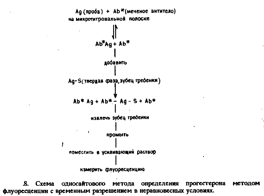 На рис.8 представлена схема одного из них, включающего несколько стадий неравновесных односайтовых анализов. В соответствующей методике применены моноклональные антитела, меченные аминофенил-EDTA-Eu, и избыток конъюгата 11-сукцинил-прогестерона с тироглобулином быка, иммобилизованного на поверхности пластиковых вкладышей. Вкладыши помещают в лунки стрипов микротитровальных планшетов. Метку измеряют в "свободной" фракции антигена на вкладыше после промывки и удаления остатков биологических образцов. В предварительных экспериментах достигнуты большая чувствительность и лучшая точность, чем в конкурентных методах иммуноанализа.