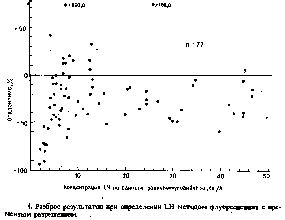 Разброс результатов. Концентрацию LH в 77 пробах плазмы, отобранных в клинике King's College от пациенток, страдающих бесплодием, определяли методом DELFIA и обычным РИА. Профиль разброса результатов представлен на рис.4. Для более чувствительного метода DELFIA типичны отклонения в отрицательную сторону по сравнению со значениями, полученными методом РИА.