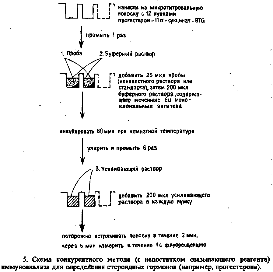 На этом же принципе основаны разработанные нами методики анализа DELFIA для прямого определения прогестерона и эстрадиола в плазме периферической венозной крови и эстрон-3-глюкуронида в разбавленных пробах мочи. В качестве иллюстрации на рис.5 представлена схема методики определения концентрации прогестерона.