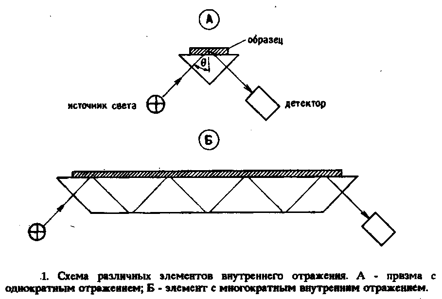 Нераспространяющаяся волна составляет часть светового потока, претерпевшего внутреннее отражение; она проникает на долю длины световой волны в среду с меньшим показателем преломления. Такая затухающая волна может оптически взаимодействовать с веществами, расположенными на поверхности или вблизи нее. Существенной характеристикой СВО является возможность непрерывного контроля реакций на поверхностях при минимальных помехах со стороны веществ, удаленных от поверхности раздела сред. Такое оптическое взаимодействие можно, изучать несколькими способами, из которых мы уделим основное внимание методу полного внутреннего отражения с флуоресценцией. Как показано на рис. 1А и 1Б, оптически более плотная среда элемента внутреннего отражения может однократно или многократно отражать световую волну. Последний тип ЭВО также называют световодом или волноводом.