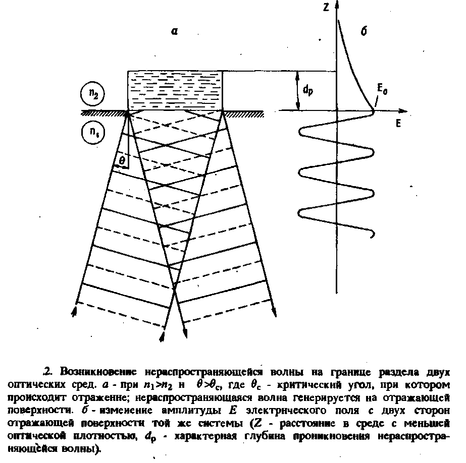 Теория. Если луч света падает на границу раздела между двумя прозрачными средами, причем луч направлен в сторону среды с меньшим показателем преломления, и если угол отражения в больше критического угла в>с >то происходит полное внутреннее отражение. В этом случае затухающая волна проникает на некоторое расстояние d>p>, меньшее длины световой волны, через поверхность отражения в среду с меньшим показателем преломления.