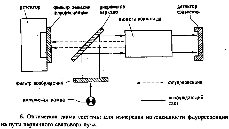 Малодоступны и флуорофоры с большим стоксовым сдвигом, например фикобилипротеины, как и соответствующие эффективные оптические фильтры. Измерение флуоресценции, генерированной в обратном направлении к лучу возбуждения, позволяет исключить эти проблемы, используя легкодоступные реагенты и оптические устройства. Типичная схема такого измерения флуоресценции представлена на рис. 6. В этой схеме свет возбуждения направляется в волновод через дихроичный делитель светового луча. Этот делитель отражает свет возбуждения и пропускает свет эмиссии. Здесь практически полностью подавляется фоновый сигнал света возбуждения, так как последний направляется от детектора.
