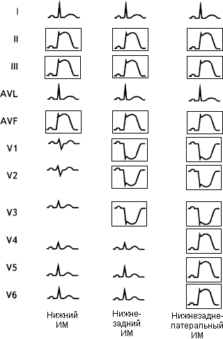 При инфаркте задней стенки (нижнем, диафрагмальном) эти изменения обнаруживаются во II, III стандартном и усиленном отведении от правой ноги (aVF).