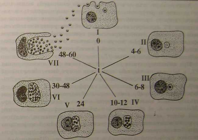 Рисунок 4.2.1 - Схема циклу розвитку хламідій в чутливій клітині: (Шаткін А.А., Мавров І.І., 1983) [5]