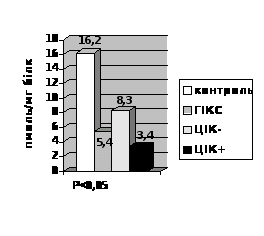 У дослідних тварин із верифікованою гіперімунокомплексемією поглиблювалося порушення “пізньої” захоплювальної здатності фагоцитів, що характеризувалася зниженням відповідного фагоцитарного показника (Р<0,02) та фагоцитарного числа (Р<0,001). У цій групі також була слабша окисно-відновна активність стимульованого НСТ-тесту (Р<0,05) і, відповідно, нижчий індекс стимуляції (Р<0,05) у порівнянні з тваринами без гіперімунокомплексемії. Важливо зазначити, що у тварин із хронічною гіперімунокомплексемією було наявне вираженіше зниження загальної комплементарної активності сироватки (Р<0,01), що може свідчити про посилену агресивність таких комплементфіксованих ЦІК з ризиком розвитку автоімунних ускладнень надалі.