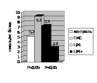 Особливо цікавими виявились результати показників синтезу оксиду азоту в нейтрофілах, моноцитах та сироватці крові щурів з хронічним гіперімунокомплексним синдромом. У всіх дослідних тварин спостерігалося вірогідне зниження рівня конституційної NO-синтази в цих клітинах (Р<0,01) водночас із зростанням рівня індуцибельної NO-синтази в нейтрофілах (Р<0,05) та в сироватці крові (Р<0,01).