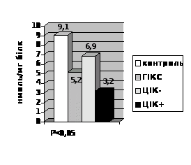 За умов серологічної гіперімунокомплексемії в дослідних тварин спостерігалось значне зниження конститутивної NO- синтази в нейтрофілах (Р<0,01) та моноцитах (Р<0,001), на тлі збільшення індуцибельної NO- синтази в нейтрофілах (Р<0,01) та моноцитах (Р<0,05), а особливо в сироватці крові (Р<0,001), порівняно з тваринами без підвищення рівня ЦІК у крові (рис. 1).