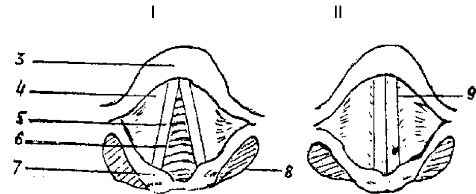 Непрямая (зеркальная) ларингоскопия I –гортань при дыхании. II – гортань при фонации.3.Надгортанник. 4.Ложная голосовая складка. 5.Истинная голосовая складка. 6.Голосовая щель. 7.Черпаловидный хрящ. 8.Грушевидный синус. 9.Вход в морганьев желудочек.