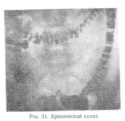 Рентгенологическое исследование, особенно ирригоскопия, в том числе в сочетании с последующим введением в кишку кислорода после ее опорожнения от бария сульфата (метод двойного контрастирования), дает возможность уточнить диагноз колита (рис. 31). Таким путем можно определить не только форму кишки, но и проследить за рельефом ее слизистой оболочки.