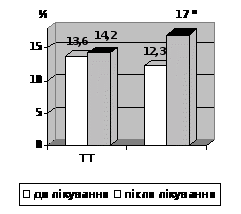Рис. 3. Показники ендотелійзалежної вазодилятації плечової артерії у хво-рих на фіброміалгію після застосування різних варіантів фармакотерапії. ТТ – традиційна терапія Примітки: * - достовірна відмінність стосовно групи «до лікування» # - достовірна відмінність стосовно аналогічної графи групи «традиційна терапія». |