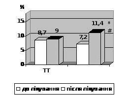 Рис. 4. Показники ендотелійнезалежної вазодилятації плечової артерії у хворих на фіброміалгію після засто-сування різних варіантів фармакотерапії. ТТ – традиційна терапія Примітки: * - достовірна відмінність стосовно групи «до лікування» # - достовірна відмінність стосовно аналогічної графи групи «традиційна терапія». |
