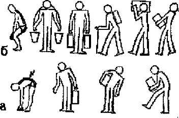 Переносите тяжести, держа их как можно ближе к телу, распределяя груз равномерно на обе руки. В любых положениях старайтесь держать туловище прямо (рис.7-б).