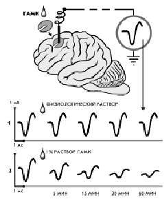 В головной мозг кошки (рис. 1), находящейся под наркозом, вводят электрод, к которому прикладывают фильтровальную бумажку, смоченную раствором ГАМК. После раздражения нерва на передней лапе записывают вызванные потенциалы на экране осциллографа. Амплитуда потенциала отражает число возбужденных нейронов и их способность к восприятию внешнего импульса. При воздействии физиологическим раствором потенциалы не изменяются (график вверху), при поступлении раствора ГАМК постепенно происходит торможение нервных клеток (график внизу).