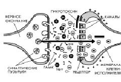 Тормозной импульс вызывает выработку синаптических пузырьков, которые выходят в синаптическую щель и выбрасывают ГАМК. Молекулы ГАМК соединяются с рецепторами, каналы в мембране открываются, и ионы хлора выходят в протоплазму, увеличивая отрицательный заряд внутри клетки и разность потенциалов на мембране. В результате обычное возбуждение клетки становится невозможным и возникает состояние торможения. Препарат пикротоксин препятствует этим процессам, воздействуя на каналы в мембране клетки-исполнителя.
