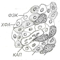 Рис 2. Передняя доля гипофиза. АА - ацидофильные аденоциты, БА - базофильные аденоциты, ХФА - хромофобные аденоциты, ФЗК - фолликулярно-звездчатые клетки, КАП - капилляр.