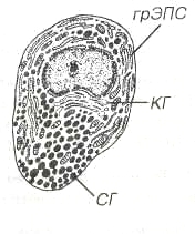Рис. 3. Ультраструктура соматотропа: грЭПС - гранулярная эндоплазматическэя сеть, КГ - комплекс Гольджи, СГ - секреторные гранулы.