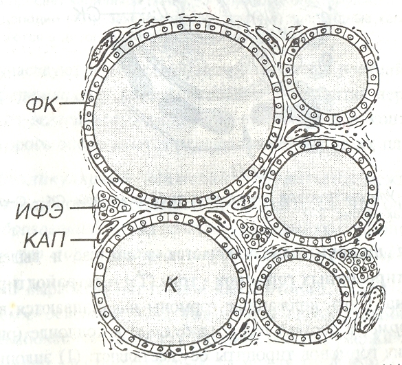 Рис. 4. Щитовидная железа. ФК - фолликулярные клетки, ИФЭ - интерфолликулярный эпителий, К - коллоид, КАП - капилляр.