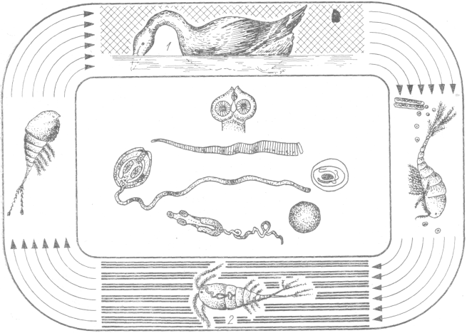 1,2-соответственно дефинитивный и промежуточный хозяева.