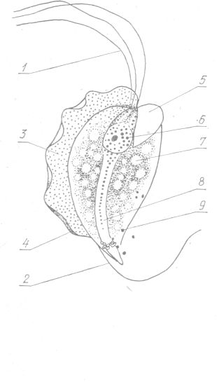 Возбудитель ― трихомонас фоетус. Эти паразиты (рис1) имеют грушевидную форму. Размеры их варьируют в пределах 8―25мкм. Они подвижны; у них есть 1,2-соответственно передние и задние жгутики, 3-ундулирующая мембрана, 4-краевая нить, 5-ротовое отверстие, 6-ядро, 7-вакуоль, 8-опорный стержень,9-включение в цитоплазме.