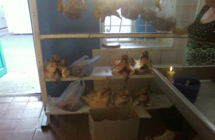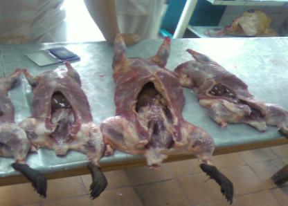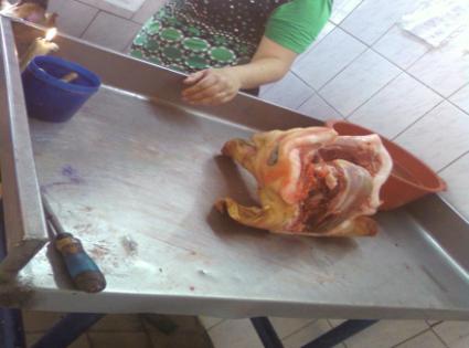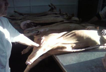 Свинина. Проверено и допущено к реализации 18 туш с полным органокомплексом. При исследовании на трихинеллёз - трихинелл не выявлено. Говядина. Проверено 3 туши (по полутушам) с полным органокомплексом. Всего выбраковано: одно лёгкое (общей массой 1,5 кг). Причина выбраковки: обширная аспирация кровью; комплект лёгких общей массой 2 кг. Причина выбраковки: 2/3 поверхности поражено серозным воспалением, перешедшим на лёгкие с плевры. |