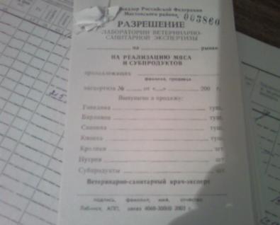 Рис. 13. Разрешение на право реализации мяса и мясопродуктов на территории рынка.