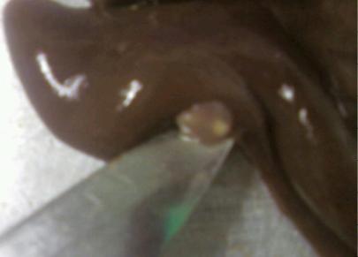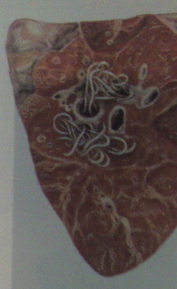 Рис. 7. Эхинококковые пузыри в печени нутрии.