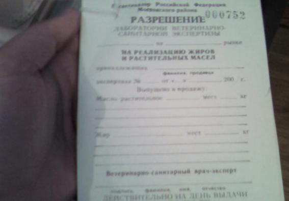 Рис. 27. Разрешение на право реализации жиров и масел растительного происхождения на территории рынка.