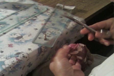 Рис.10. Нарезка проб с ножек диафрагмы для трихинеллоскопии.