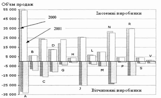 Розглядаючи співвідношення обсягів продажу між вітчизняних і закордонних виробників у динаміці, слід зазначити, що протягом третього і четвертого кварталів 2002 року питома вага продажу продукції іноземних компаній почала поступово збільшуватися (Рис. 1.2)
