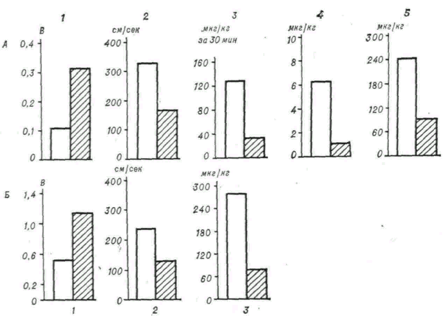 1 - пороги возбудимости преганглионарных волокон у кошек; 2 - пессимальные частоты преганглионарной тетанизации у кошек; 3 - активность холпнэстеразы в ганглиозной ткани кроликов; 4 - пороговые дозы ацетилхолина, стимулирующие ганглии кошек; 5 - пороговые дозы бензогексония, угнетающие ганглионарную передачу возбуждения у кошек; белые столбики - взрослые животные; заштрихованные - старые животные.