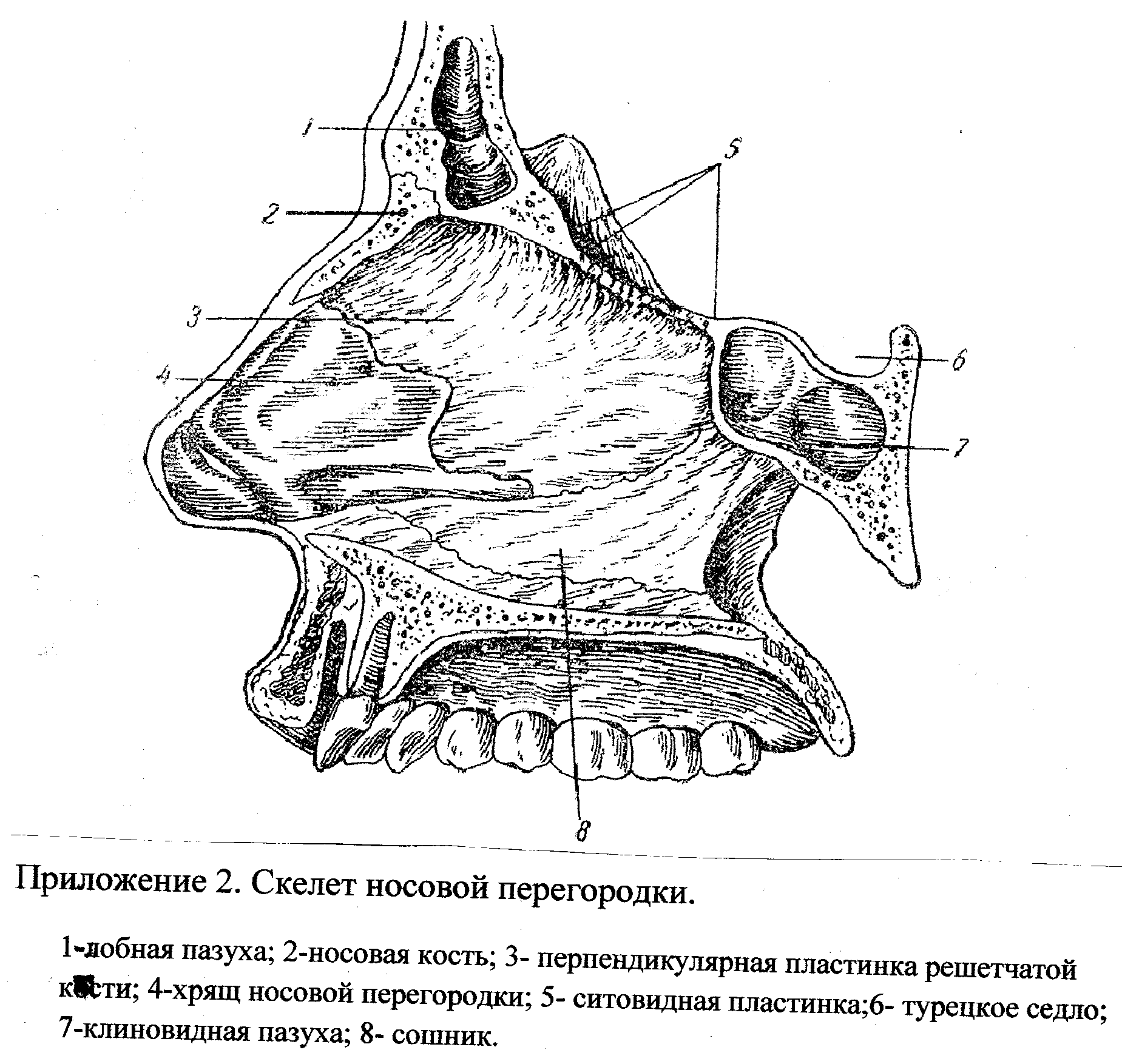 Носовая перегородка (pars ossea) образована сверху перпендикулярной пластинкой (lamila perpendikularis) сзади и снизу последняя соединяется с сошником (vomer) , а спереди и снизу — с хрящом носовой перегородки (cartilage septi nasi) . Впереди переднего края хряща носовой перегородки имеется подвижная перепончатая часть (pars membranacea septi nasi). У новорожденного перпендикулярная пластинка еще не развита. Хоана имеет форму поперечной щели.