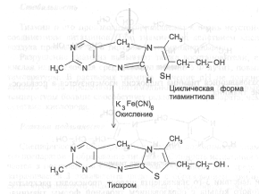 При действии 3-го эквивалента щелочи происходит раскрытие тиазолового кольца с образованием тиольной формы тиамина, которая при дегидратации превращается в циклическую форму тиаминтиола. Окисление последнего приводит к образованию тиохрома: