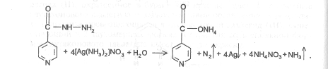 Изониазид. 1) Реакция окисления изониазида аммиачным раствором серебра нитрата и меди сульфата. Если реакцию проводить в нейтральной среде, сначала образуется комплексная соль, а затем (при нагревании) процесс переходит в окислительно-восстановительный с выделением металлического серебра.