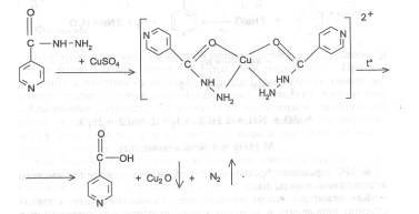 2) Реакция с меди сульфатом происходит в 2 этапа. За счет кислотных свойств изониазида сначала образуется комплексная соль голубого цвета. При последующем нагревании происходит окисление препарата с получением желто-зеленого, а затем грязно-желтого окрашивания с одновременным выделением пузырьков газа.