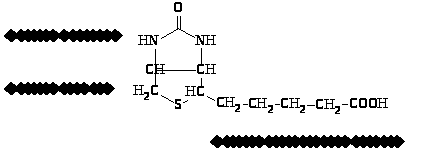 Исследования химического строения биотина показывают, что он представляет собой соединение гидрированного тиофена с мочевиной и валериановой кислотой:
