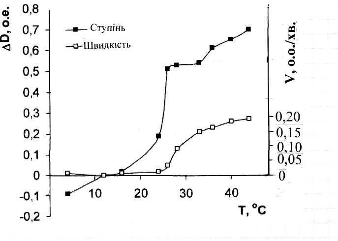 5. Показано, що ступінь і швидкість дезагрегації тромбоцитів граміцидином S найбільші в області структурних фазових переходів ліпідів мембран (180С – 330С). При вищих температурах ці параметри дезагрегації знижуються, що свідчить про більшу стійкість агрегатів при температурі тіла.